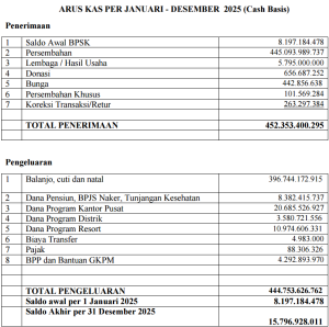 By admin / March 21, 2026 5 thoughts on “Summary Arus Kas 2025” Cst. Ivan panjaitan March 22, 2026 at 12:39 pm Ijin tanya, Pengeluaran poin ke dua -tunjangan kesehatan. Apa saja cakupannya, apakah iuran bpjs kesehatan fulltimer beserta keluarga.? Reply admin March 22, 2026 at 2:07 pm Tunjangna kesehatan berupa BPJS kesehatan hanya untuk pegawai Kantor Pusat. Reply St.B.Sihaloho SE March 26, 2026 at 3:56 am Ingin bertanya Amang…point penerimaan nomor 3, hasil lembaga/Usaha…usaha apa saja yang sudah termasuk didalamnya…? Reply admin March 26, 2026 at 7:02 am Tahun 2026, Lembaga Usaha yang menyetorkan Dana hanya Sopo Marpikir. Namun ditahun 2025, BPSK menerima dari STT, Percetakan HKBP, Sopo Marpikir dan SGH Reply Leave a Comment Cancel ReplyYour email address will not be published. Required fields are marked *Type here.. Name* Email* Website Save my name, email, and website in this browser for the next time I comment.
